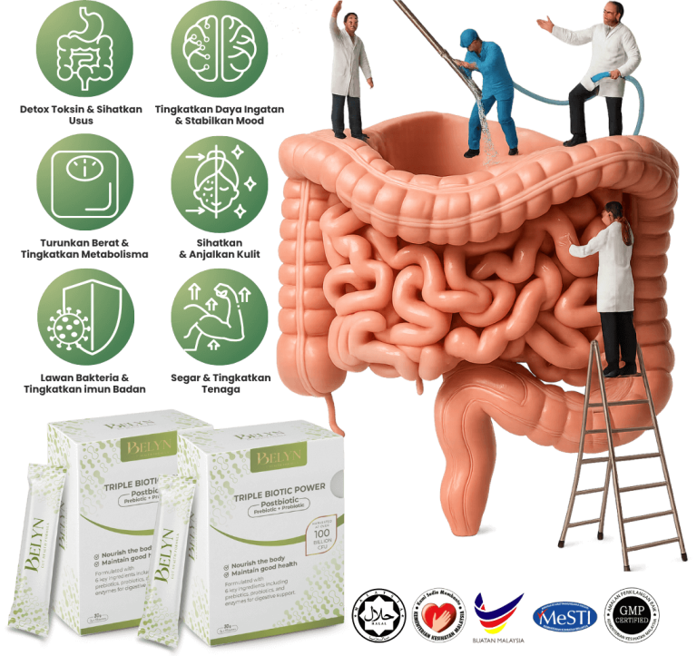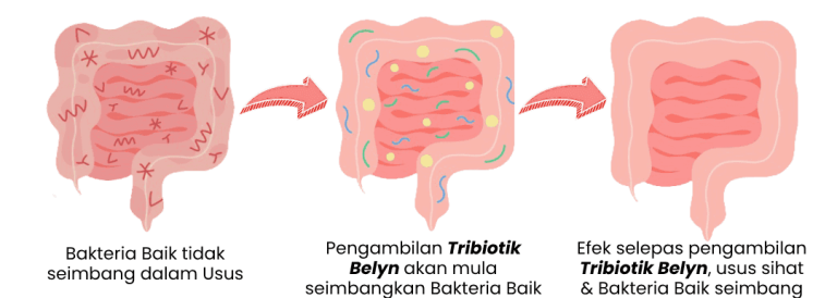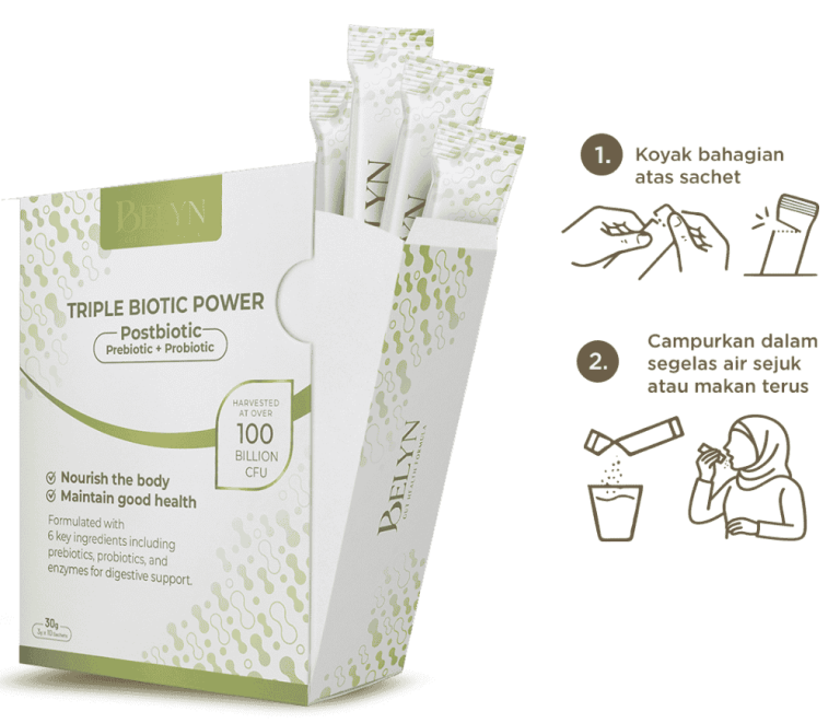 Belyn ni minuman serbuk tribiotic (prebiotik, probiotik & postbiotik) untuk bantu: